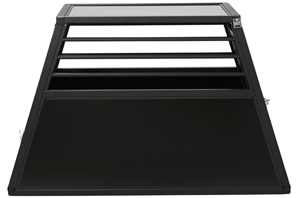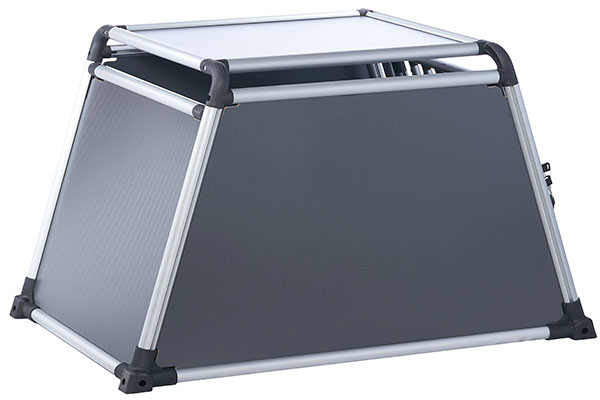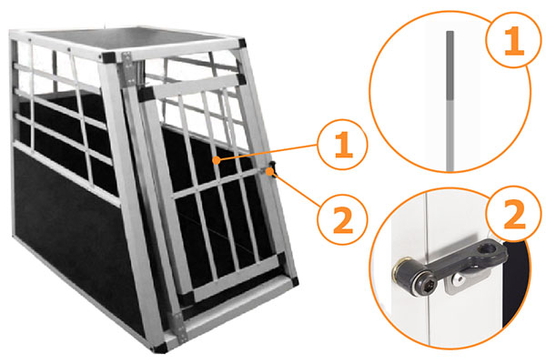 Sikkerhed frem for alt. Kraftig skydelås holder døren sikkert lukket under transport. Den er konstrueret så det er umuligt for hunden selv at åbne. Super nem betjening med kun 1 hånd - både når buret skal åbnes og lukkes.