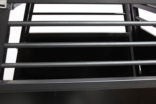 Bemærk hængslerne og tremmerne på hundeburet. De er ekstra kraftige, og er blot ét eksempel på at buret er lavet i solide, kraftige og sikre materialer. Herudover er tremmerne væsentligt mere massive end på andre mærker, og selv siderne af buret er lavet af ekstra tykke high density fiberboards.