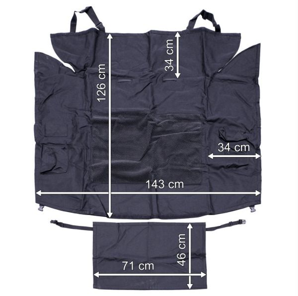 Stor og praktisk beskyttelsesmåtte som beskytter både din kofanger, når hunden skal ind og ud af bilen, og hele bagagerummet. Den monteres supernemt ved nakkestøtterne og velcro i siden. Skridsikkert materiale gør at hundeburet bliver stående fast og sikkert uden at glide rundt. Der er smarte lommer i siden, hvor man kan opbevare hundesnore, godbidder og hvad man ellers kan finde på.
